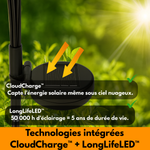 ✔️ Technologie CloudCharge™ — capte les rayons du soleil même par temps couvert et en hiver, assurant jusqu’à 12h d’éclairage continu.