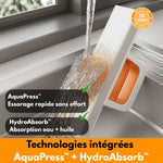 Les technologies exclusives AquaPress™ et HydroAbsorb™ garantissent un nettoyage efficace même sur l’huile ou les résidus de savon.