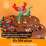 ✅ Contenu : 204 pièces — plaques carrées/rectangles ×8, disques ×8, équerres ×8, triangles ×8, barres ×8, vis ×60, chevilles/boutons ×70, écrous ×30, perceuse ×1 (2 embouts), tournevis ×1 (2 embouts), petite clé ×1, piles incluses, notice 60+ modèles