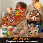 Vous recevez 204 pièces + notice 60+ modèles : plaques/disques/triangles/barres, vis, écrous, boutons, perceuse à piles (2 embouts, piles incluses), tournevis (2 embouts) et petite clé.