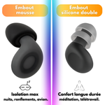 ✔️ DualShell™ Acoustic Core — double enveloppe acoustique combinant mousse mémoire interne et coque silicone médicale, pour absorber les ondes sonores sans comprimer l’oreille.