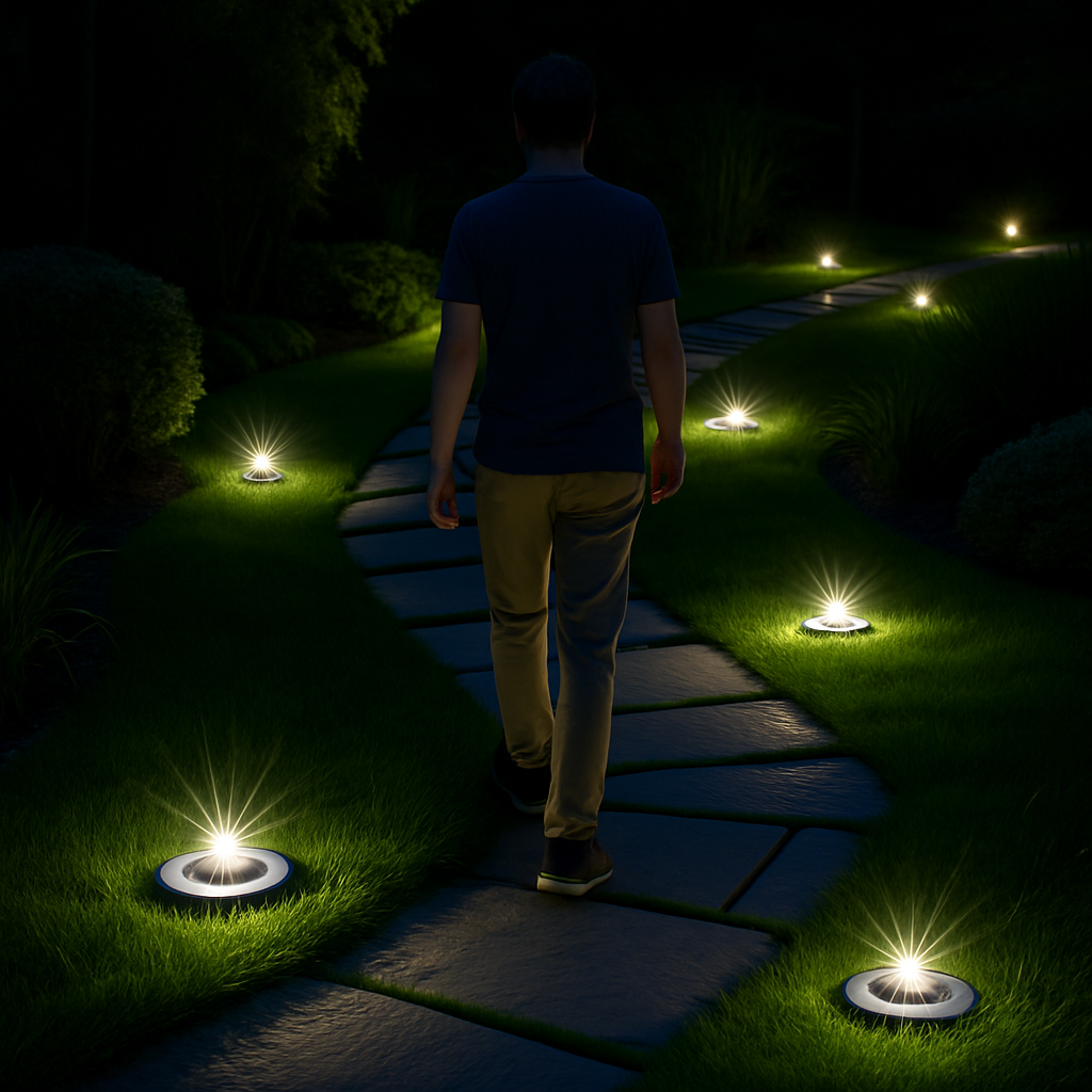 En plein jour, elles se fondent dans le sol et passent presque inaperçues. Dès que le soleil se couche, le rendu lumineux met en valeur tout le jardin.