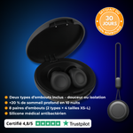✅ Contenu : 4 paires Embouts Douceur Intégrale (XS–L) + 4 paires Embouts Confort Mémoire (XS–L) + Étui ventilé antidérapant + cordon de transport + E-book offert
